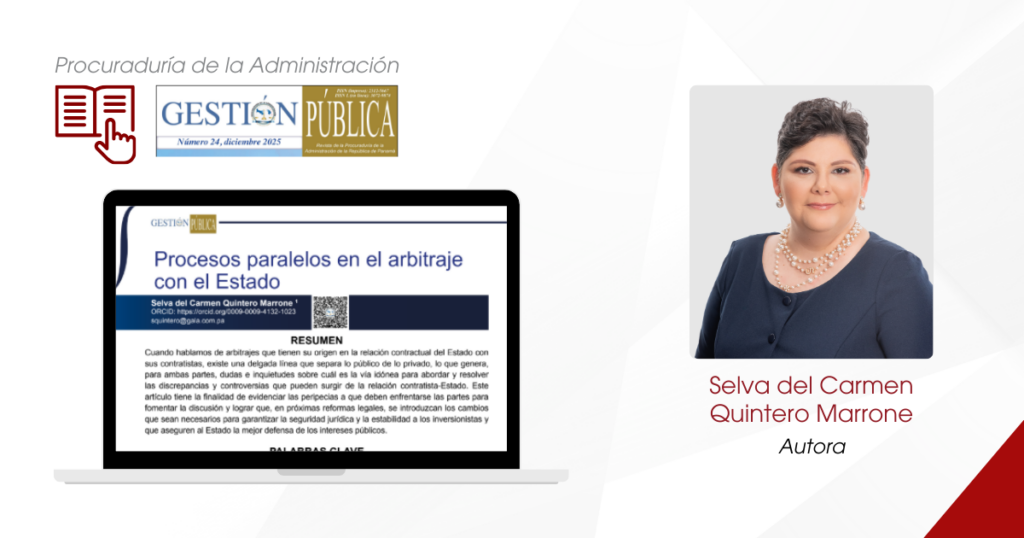 Compartimos el artículo “Procesos paralelos en el arbitraje con el Estado», autoría de nuestra socia, Selva del Carmen Quintero Marrone, el cual fue publicado, por invitación de la Procuraduría de la Administración, en su prestigiosa revista Gestión Pública, y encabeza esta Edición #24 del mes de diciembre pasado, que corresponde a su publicación anual del año 2025.